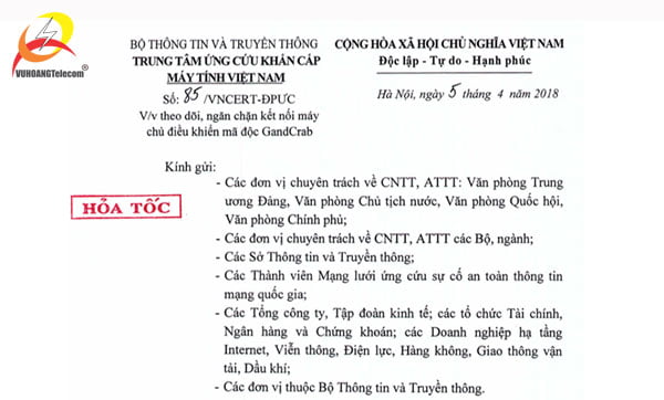 Vào chiều 5/4, Trung tâm Ứng cứu khẩn cấp máy tính Việt Nam (VNCERT), Bộ Thông tin và Truyền thông (TT&TT) phát lệnh ra mã độc này và tiến hành điều phối yêu cầu các cơ quan, doanh nghiệp trên toàn quốc thực hiện khẩn cấp việc theo dõi, ngăn chặn kết nối tới những máy chủ điều khiển mã độc tống tiền GandCrab.