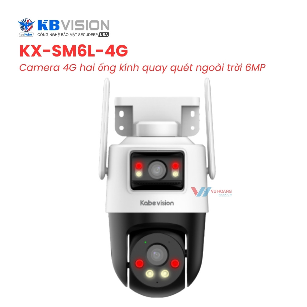 Camera KBVISION KX-SM6L-4G là camera 4G hai ống kính ngoài trời độ phân giải 6MP (3MP+3MP), tích hợp sim 4G, chiếu sáng kép hồng ngoại và LED ấm 30m, cảnh báo chủ động bằng đèn chớp và còi hú. Phù hợp lắp đặt nơi không có Internet, hỗ trợ thẻ nhớ 256GB và đàm thoại 2 chiều.