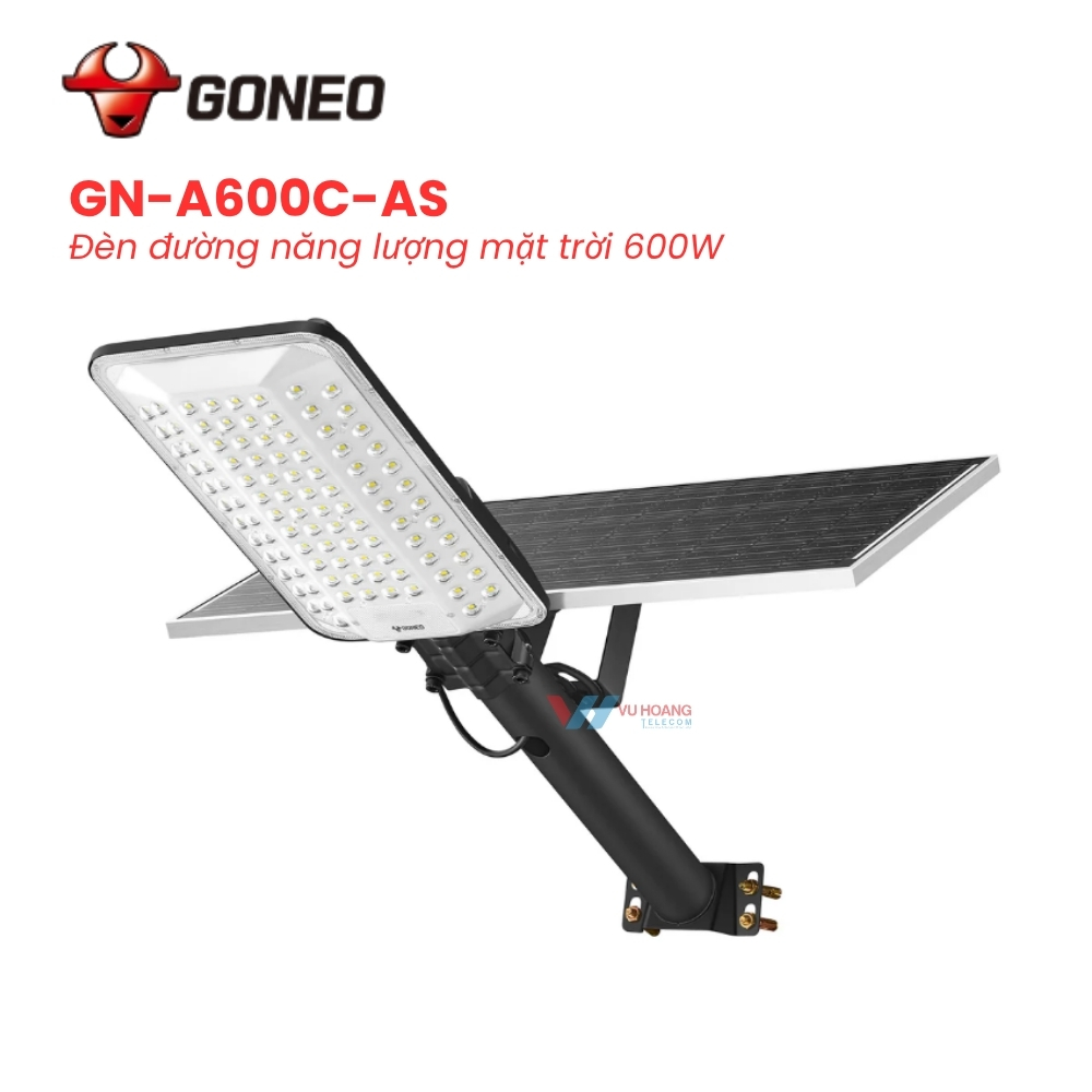 GONEO GN-A600C-AS hội tụ đủ yếu tố cho đèn đường solar dùng ngoài trời lâu dài: thân nhôm đúc bền vững, pin LiFePO4 2000 chu kỳ, quang thông 3100lm và chuẩn chống nước IP65. Liên hệ Vũ Hoàng Telecom để được báo giá và tư vấn lắp đặt phù hợp với tuyến đường thực tế của bạn. Tham khảo thêm thông tin tại Facebook Vuhoangtelecom nhé.