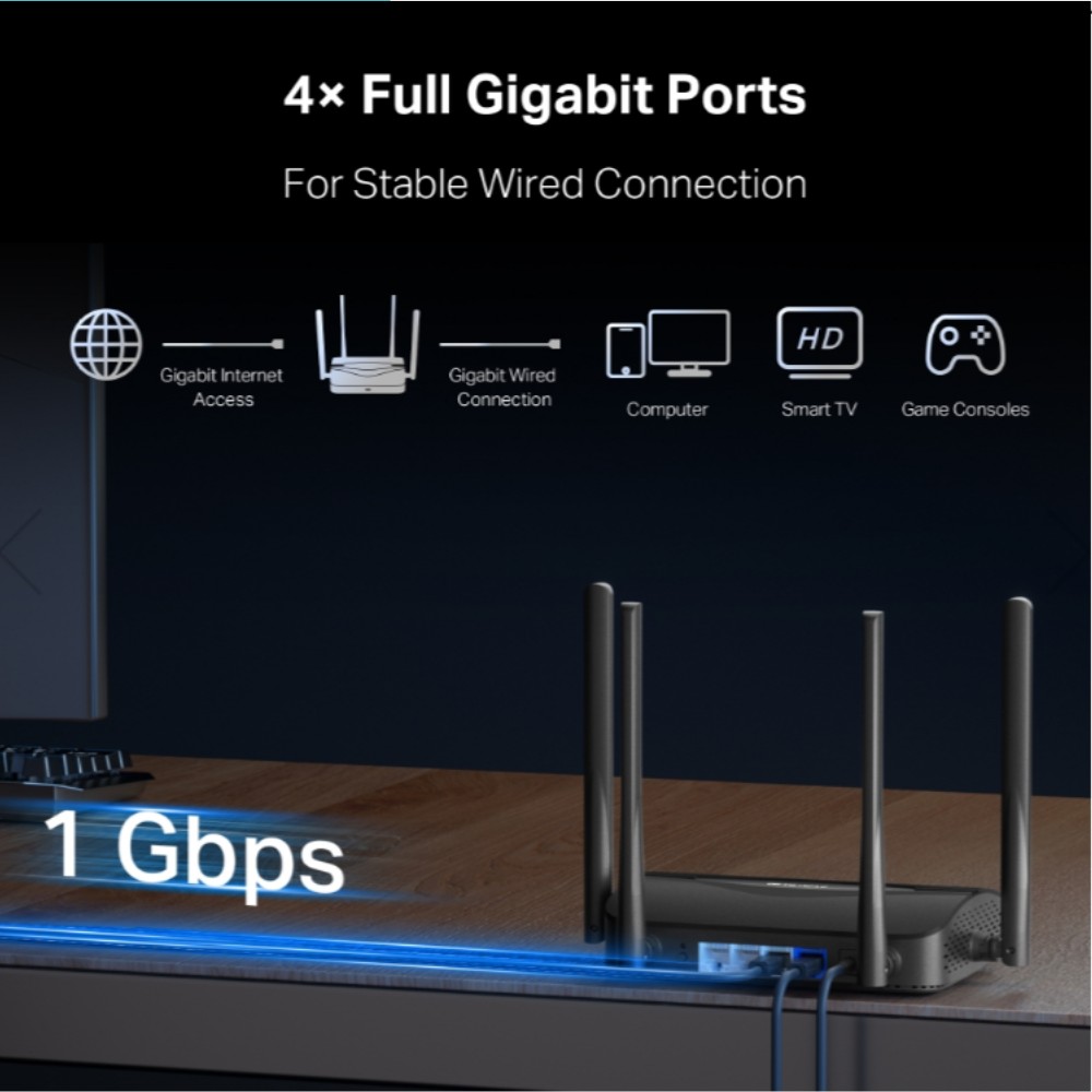 – Cổng kết nối: 1 × Gigabit WAN + 3 × Gigabit LAN.