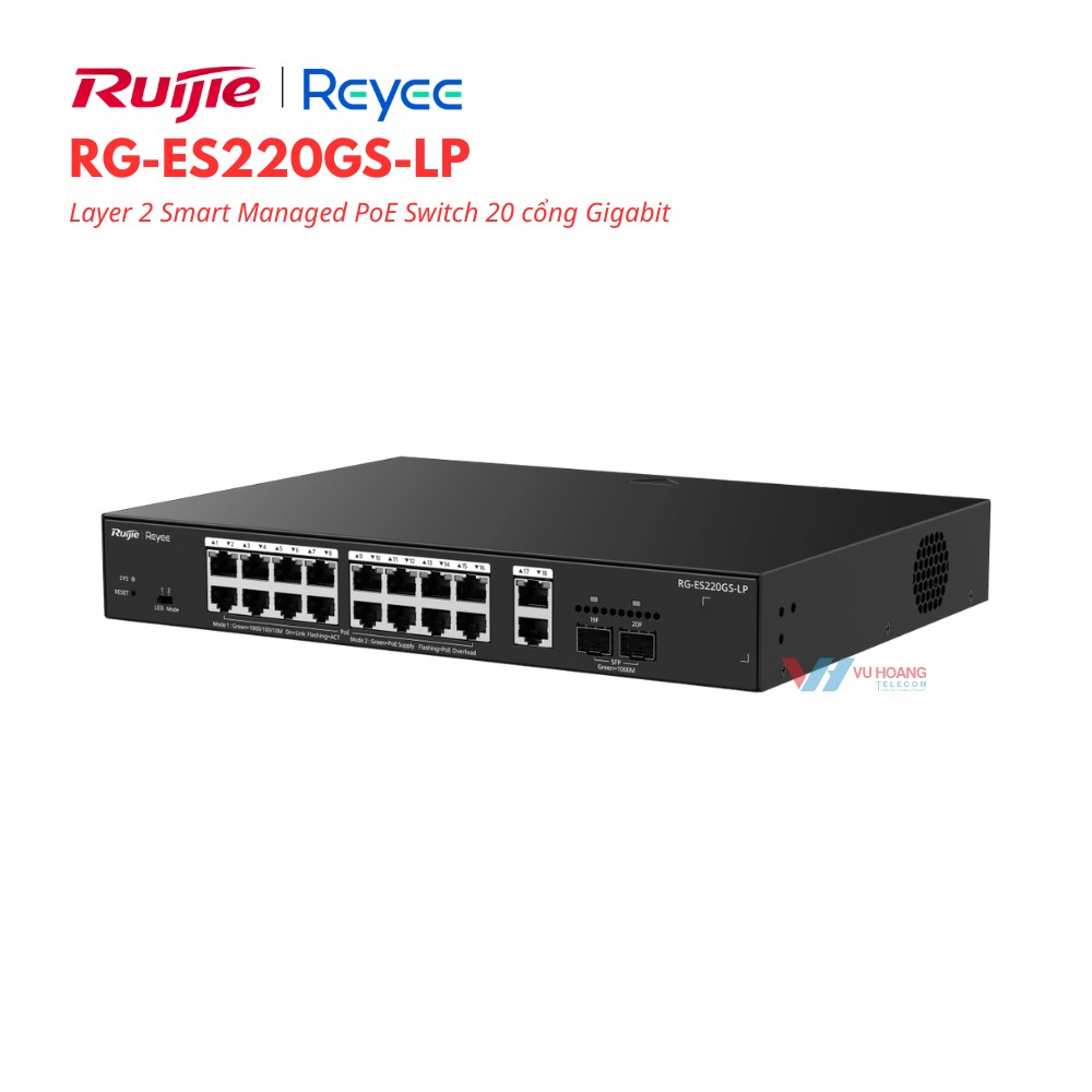 Smart Managed PoE Switch Reyee RG-ES220GS-LP là lựa chọn cân bằng tốt giữa tính năng và chi phí cho hệ thống camera an ninh và mạng doanh nghiệp vừa nhỏ. 16 cổng PoE 130W, nhận dạng camera tự động, PoE watchdog và Ruijie Cloud miễn phí tối ưu vận hành từng ngày. Liên hệ ngay HOTLINE 1900 9259 để được hỗ trợ tốt nhất. Tham khảo thêm hình ảnh tại Facebook Vuhoangtelecom nhé.